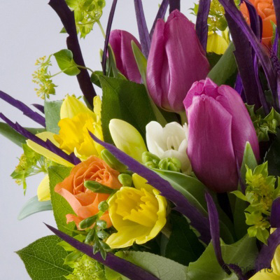 A beautiful handtied bouquet of vibrant scented spring flowers presented in a glass vase. Selection may vary to those shown