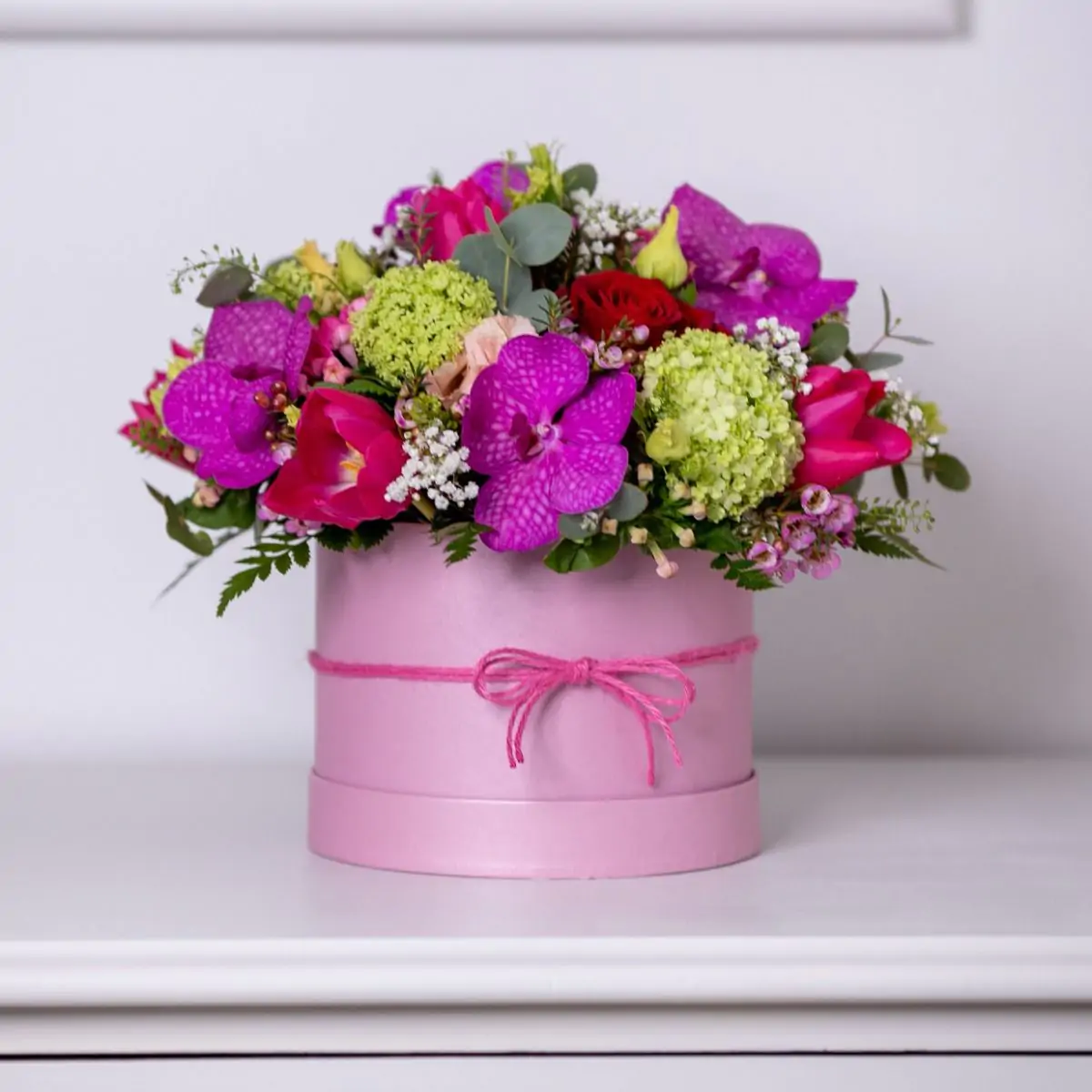 This luxury Hat Box is filled with vibrant \orchids and complimentary seasonal flowers designed to make the vibrant colours pop